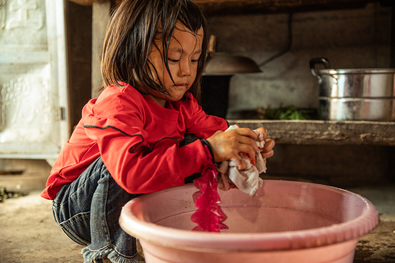 身邊(biān)沒有大人照顧,女孩小小年紀(jì)就開始學(xué)會做家務。