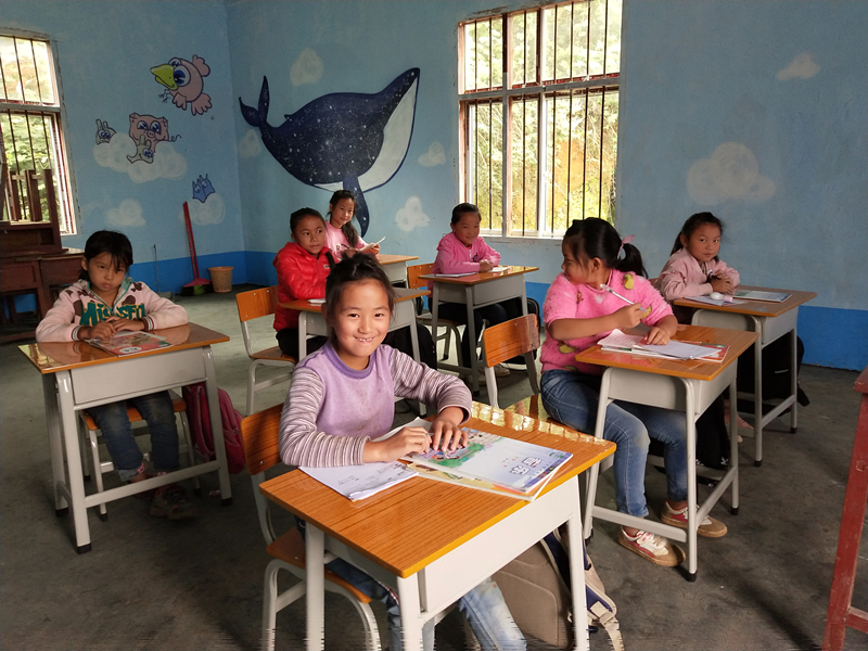 在煥然一新的教室裏用上嶄新(xīn)的桌椅,孩子們的臉上露出了開心的笑容。