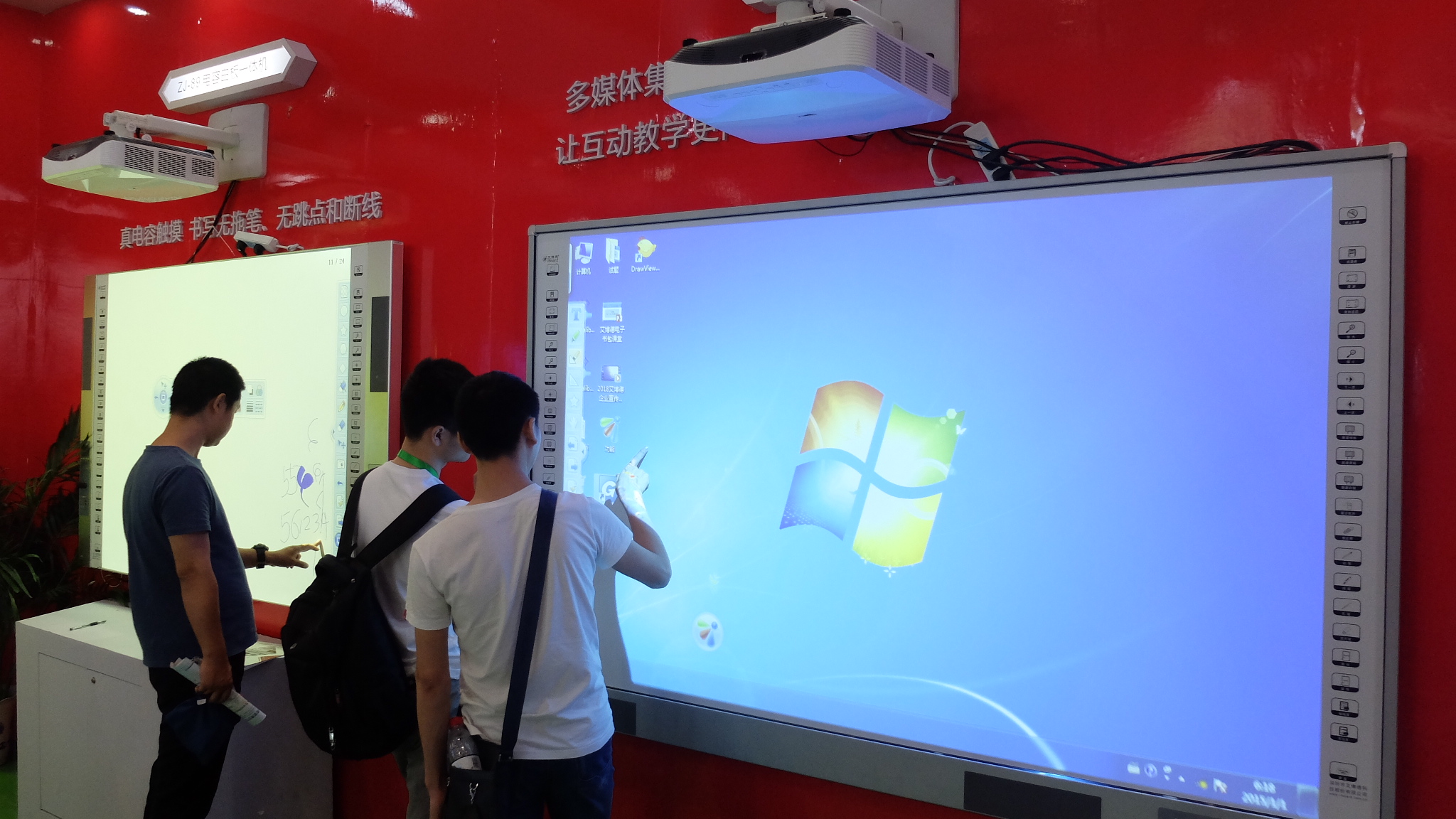 麻花传媒XK8046白板一體機搭配超短焦激光投影機組合而成的多媒體教學方案,引起了現場嘉賓(bīn)的濃厚興趣。多媒體一體機集合電子白板、投影、功放、音響(xiǎng)、電腦、視(shì)頻展台、中控(kòng)、麥克風等多媒體設備功能於一體,滿足現代教學應用需求,一(yī)舉解決當(dāng)前多媒(méi)體教室各種設(shè)備分散、連接雜(zá)亂、操作繁瑣、設(shè)備協調與兼容性差等問題(tí)。